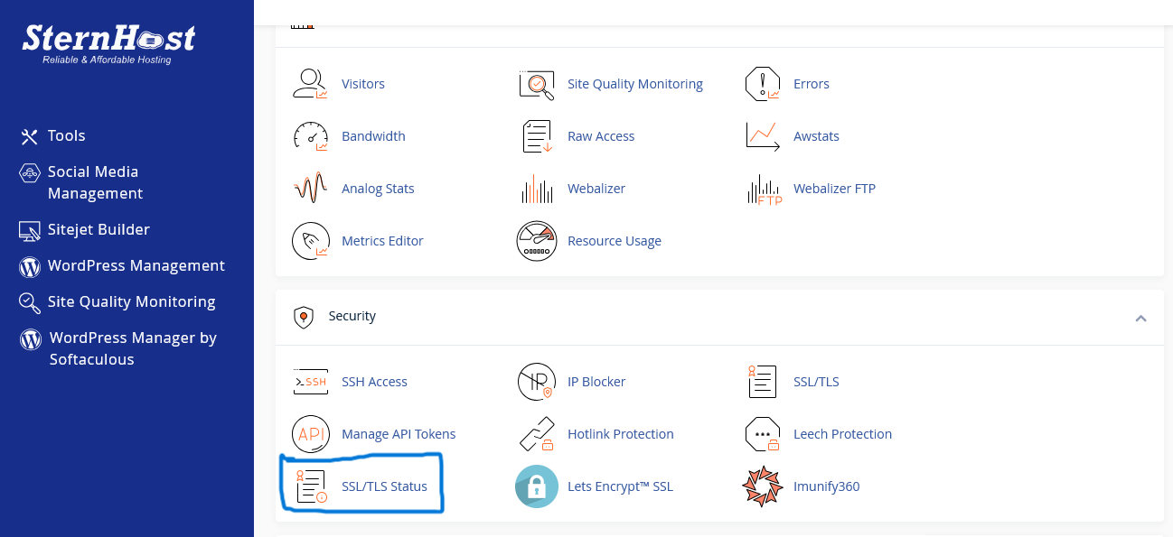 2. Navigate to SSL/TLS Status Scroll down to the Security section and click on the SSL/TLS Status icon. This is different from the standard "SSL/TLS" manager; this specific tool allows you to view the status of your AutoSSL coverage.